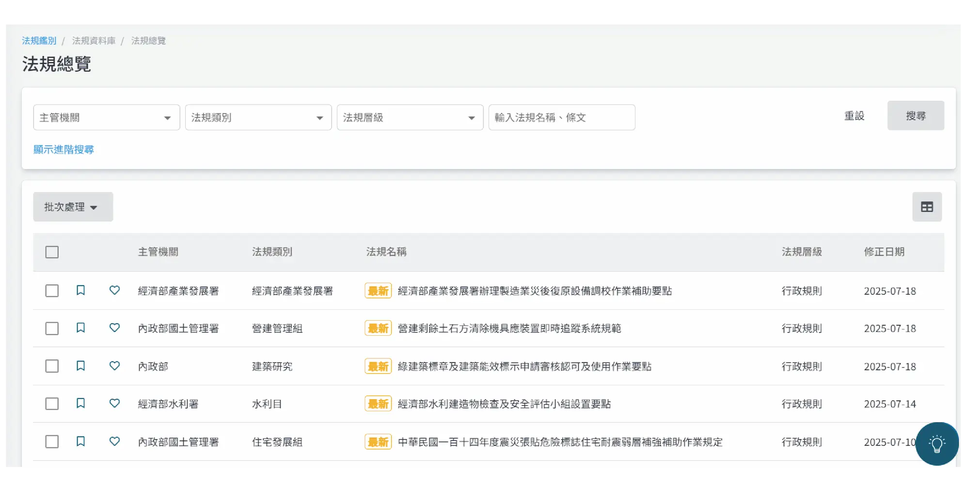 內建數十萬筆法規條文,完整涵蓋勞動部、環境部、消防署等多部會規範,提供企業完善的法規資料庫。