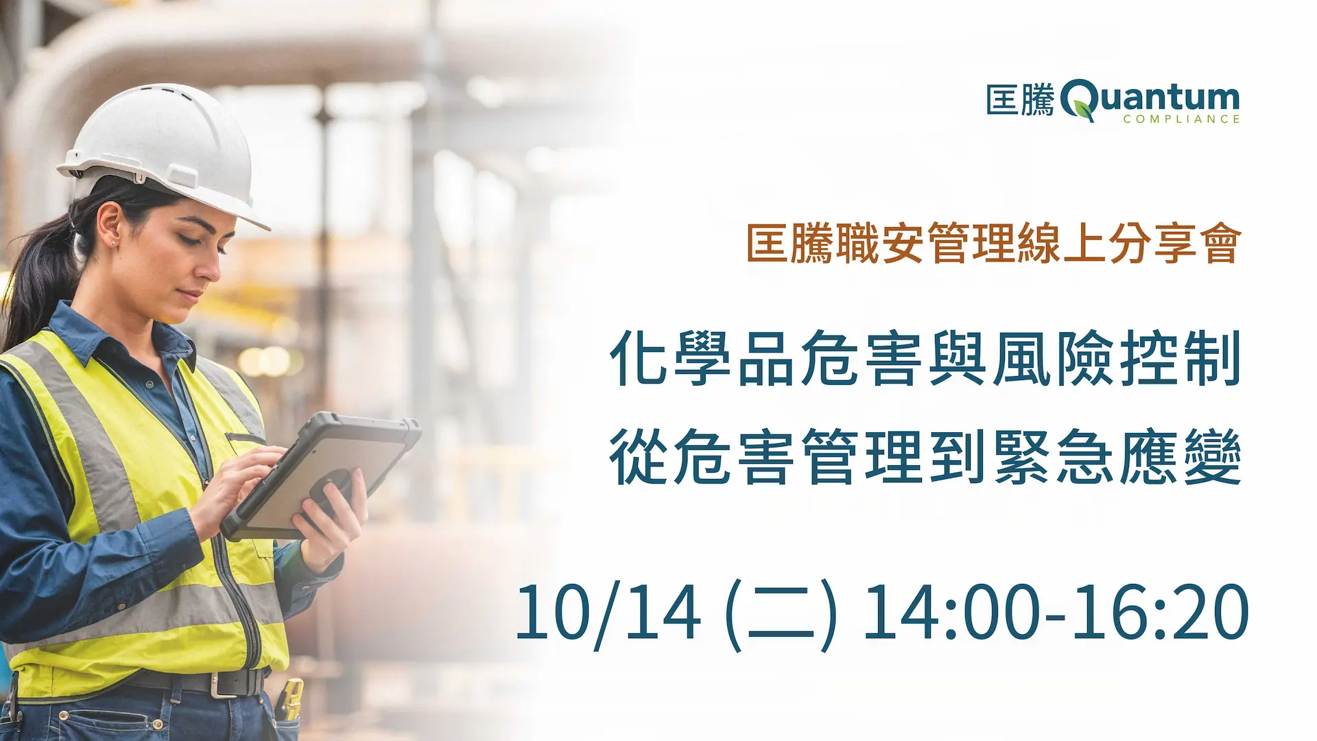 本分享會延伸自 8/21 匡騰實體研討會【化學品作業安全與申報法規實務】,聚焦化學品作業安全、危害辨識到緊急應變全流程,特別規劃為線上專題【化學品危害與風險控制:從危害管理到緊急應變】,讓更多企業職安及化學品管理人員能共同參與,掌握最新的安全與合規趨勢。