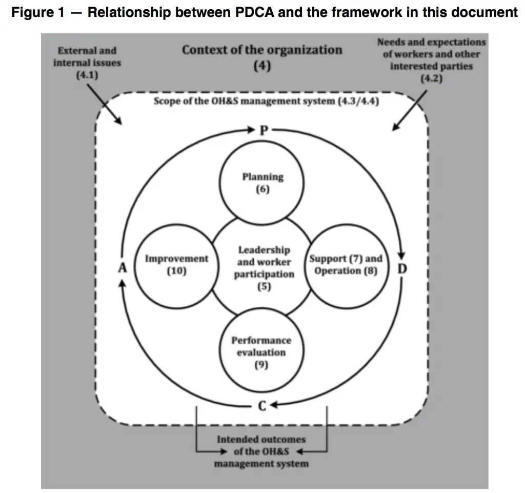 整體而言ISO 45001標準建構於高階管理架構(HLS)上,流程導向(Process-based)的系統邏輯如同在2015年更新發佈的ISO9001品質管理標準及ISO14001環境管理標準,同樣將管理系統的規劃(Plan)、執行(Do)、查核(Check)、改善(Action)的PDCA精神貫徹始末,巧妙融於各章節條文要求之中。