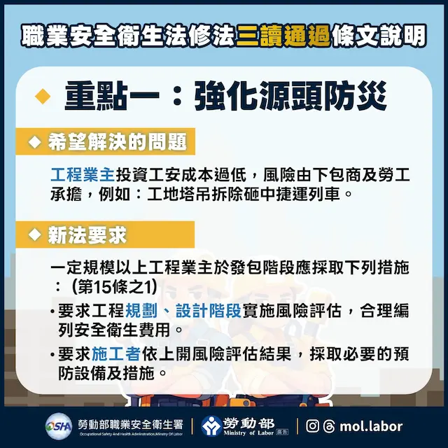 根據勞動部公布之修正條文,新增第15條之1明定:一定規模以上工程,業主須於規劃、設計階段進行危害分析,並編製安全衛生圖說與規範,納入經費中。此舉不僅制度化「設計即安全」理念,更明確將責任上移至發包端,避免以往安全責任僅落在營造廠或下游承攬商的問題,也反映主管機關試圖從制度源頭介入,將職安要求正式納入工程決策與資源配置流程之中,而非僅作為事後補強的管理項目。