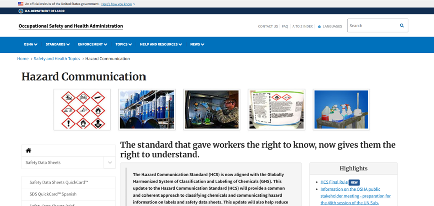 美國的GHS及SDS相關規範內容,可於美國職業安全與健康管理局 (The Occupational Safety and Health Administration, OSHA) 網站查找,網站的主題中有個 Hazard Communication 專門頁面,提供美國危害通識標準、施行指南等資訊,包含安全資料表、GHS危害標示、圖式符號(Pictogram) 等規格說明。