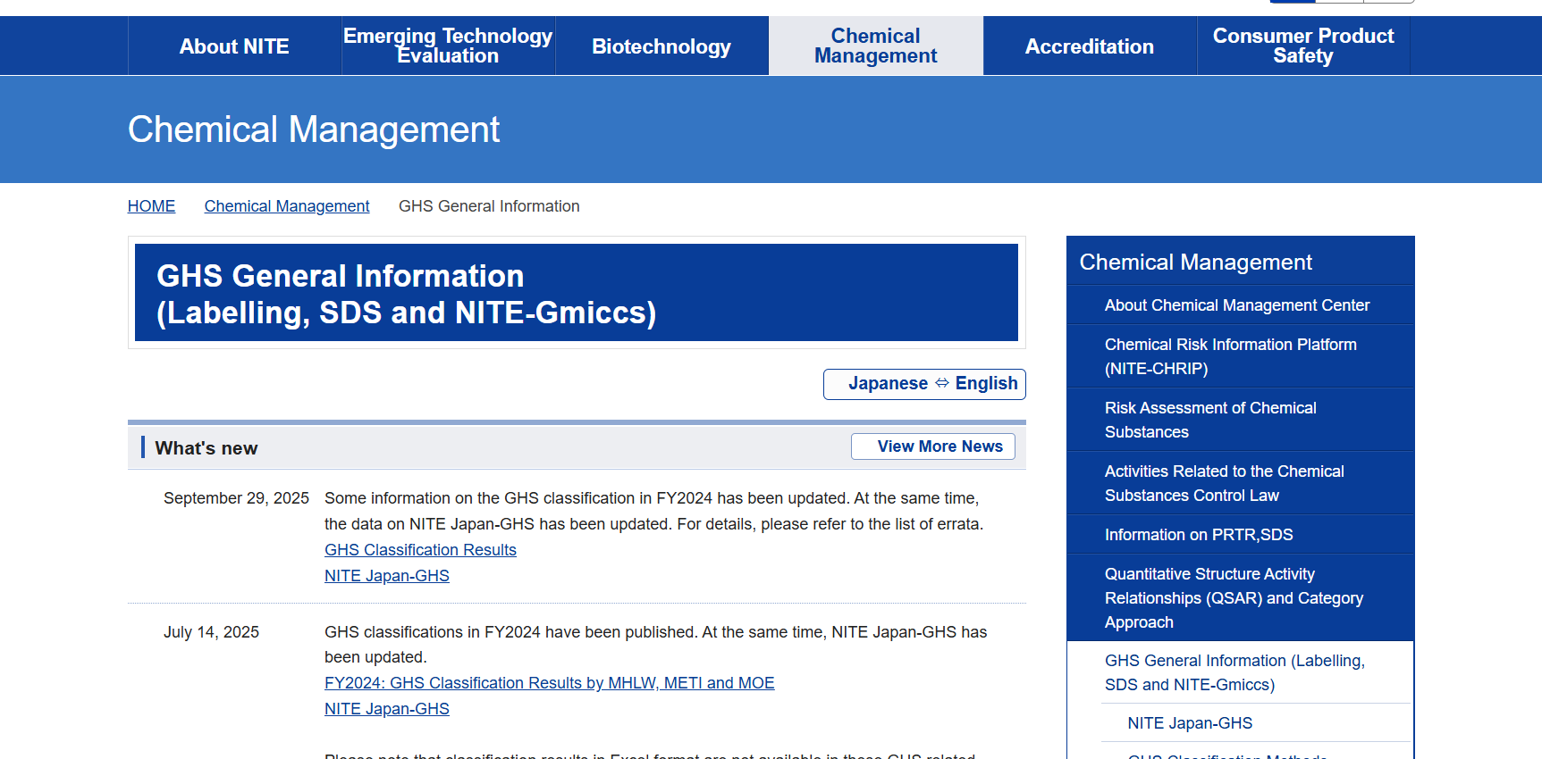 關於日本 GH S及 SDS 相關規範,則可於日本經產省下屬獨立行政法人製品評價技術基盤機構 (National Institute of Technology and Evaluation, NITE) 的網站搜尋,裡面包含日本採用的GHS規範、化審法及安衛法的編號、危害分類、危害警告訊息、SDS 格式及內容標準等相關資訊,供企業參考。
