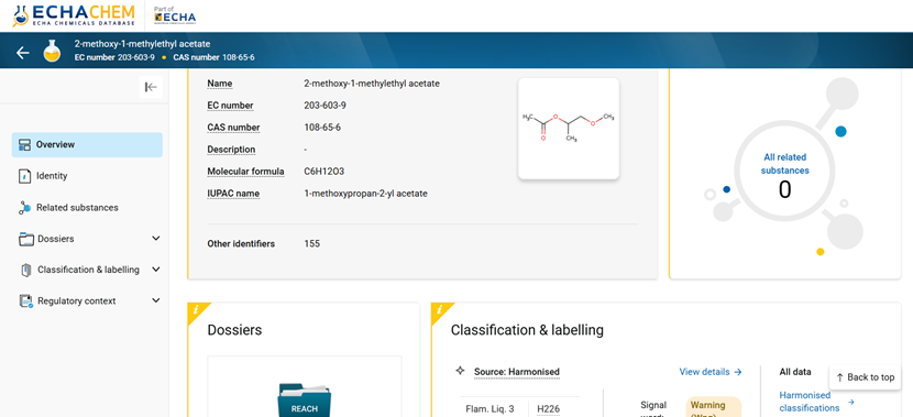 ECHA 提供了 ECHA CHEM 網站 (新版),列出了多種化學物質的危害分類與標示、CAS NO. 等數據,應為目前業界公認最大的化學物質數據資料庫。